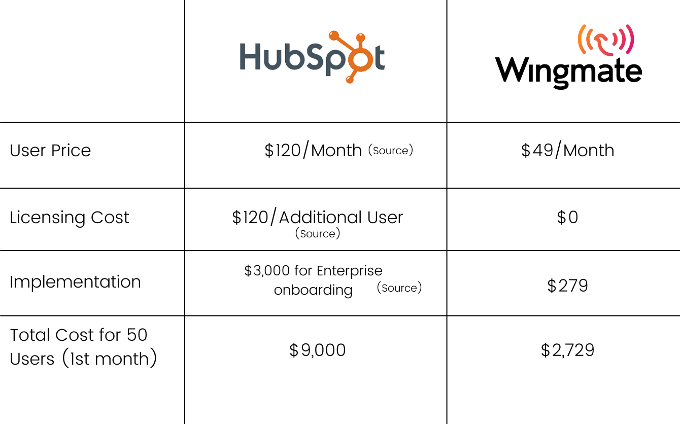 Wingmate and Hubspot present different pay structures. Hubspot, like other large CRM applications, is priced based on large enterprise plans. Hubspot isn’t the type of application you can use out of the box without at least some knowledge of complex systems. Since every business has different needs, implementation and start-up costs are associated with this CRM in order to customize.