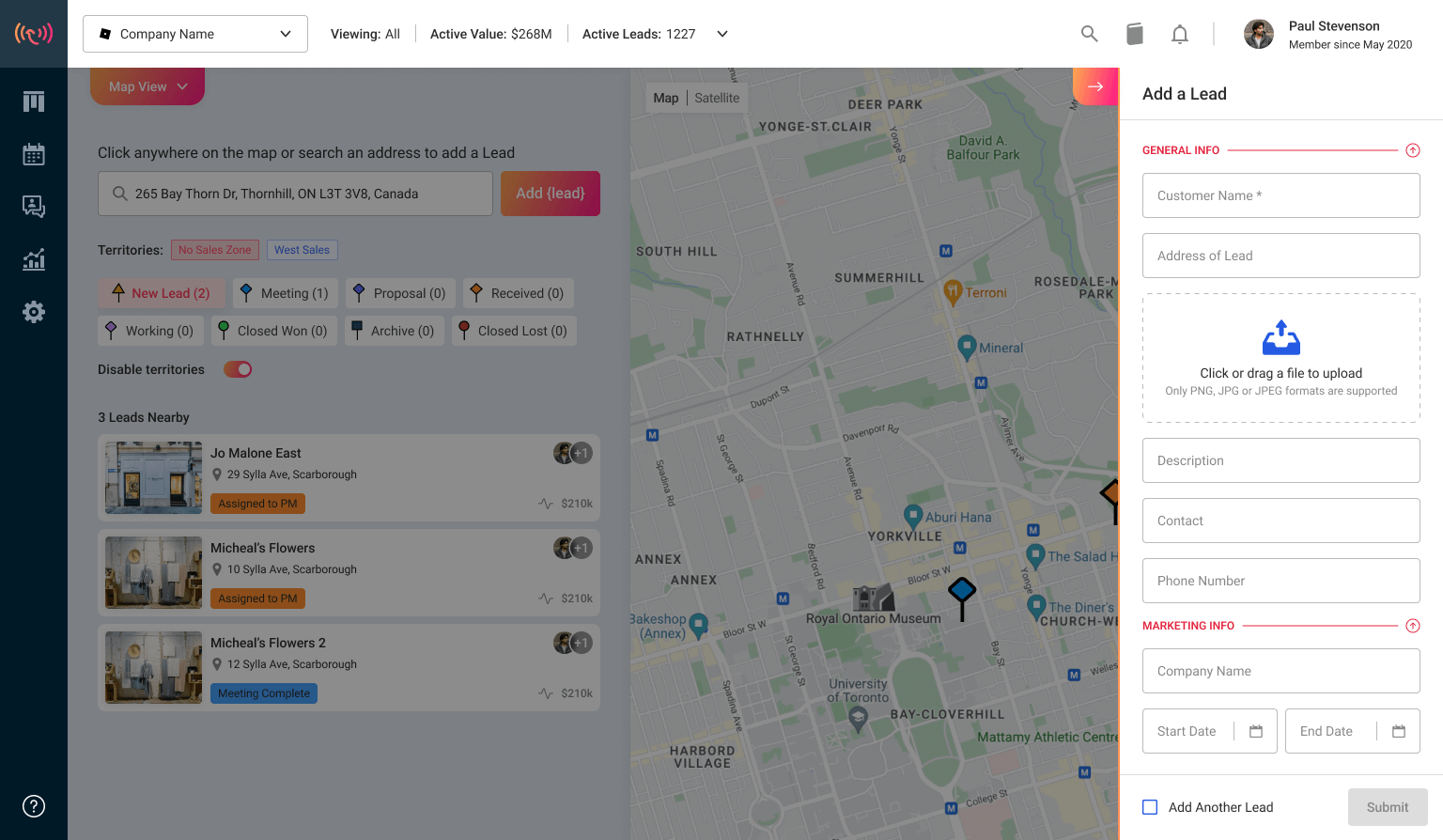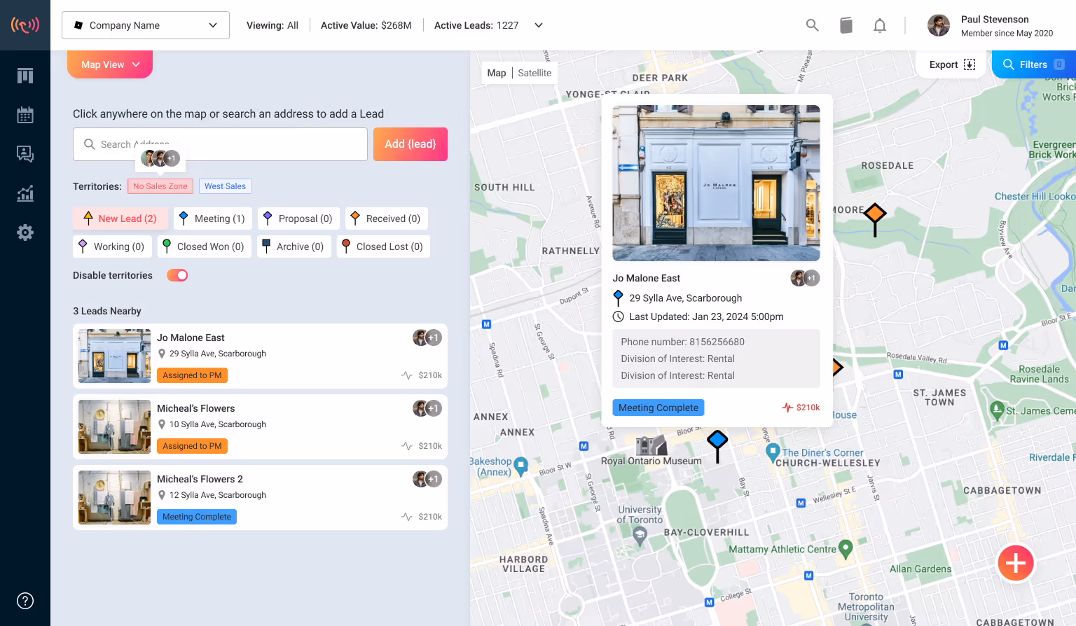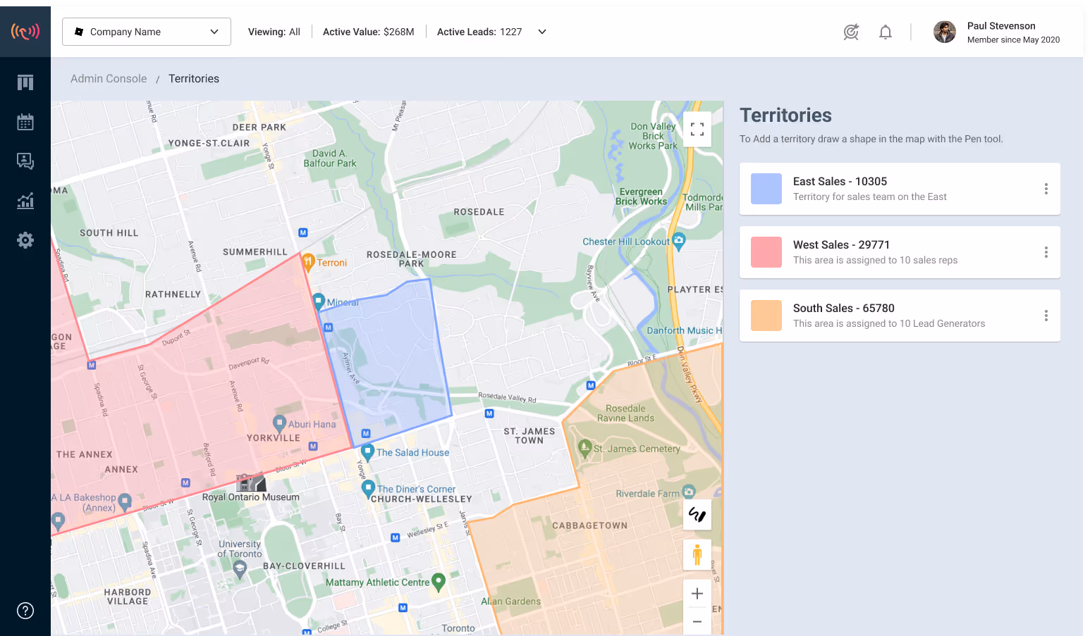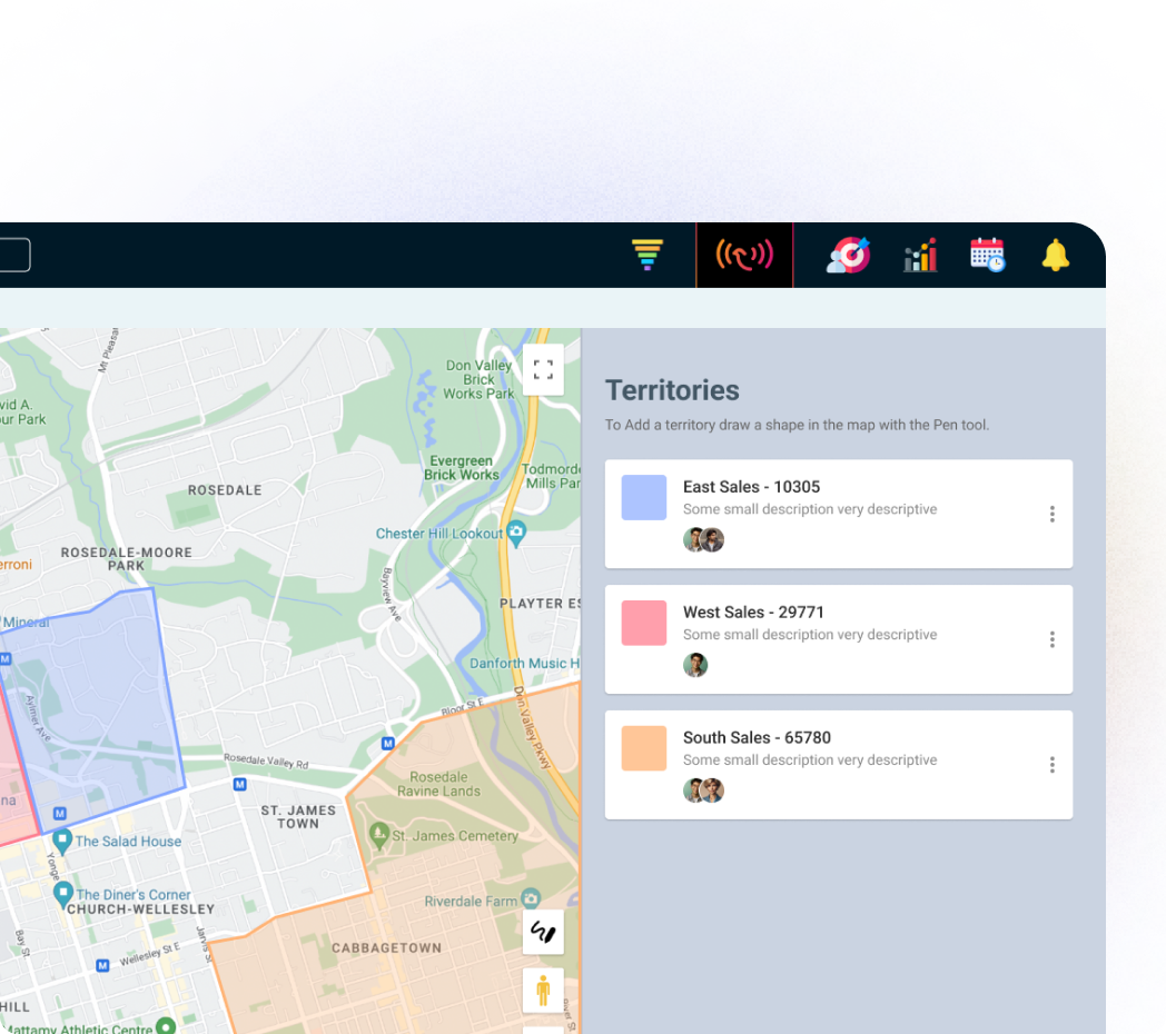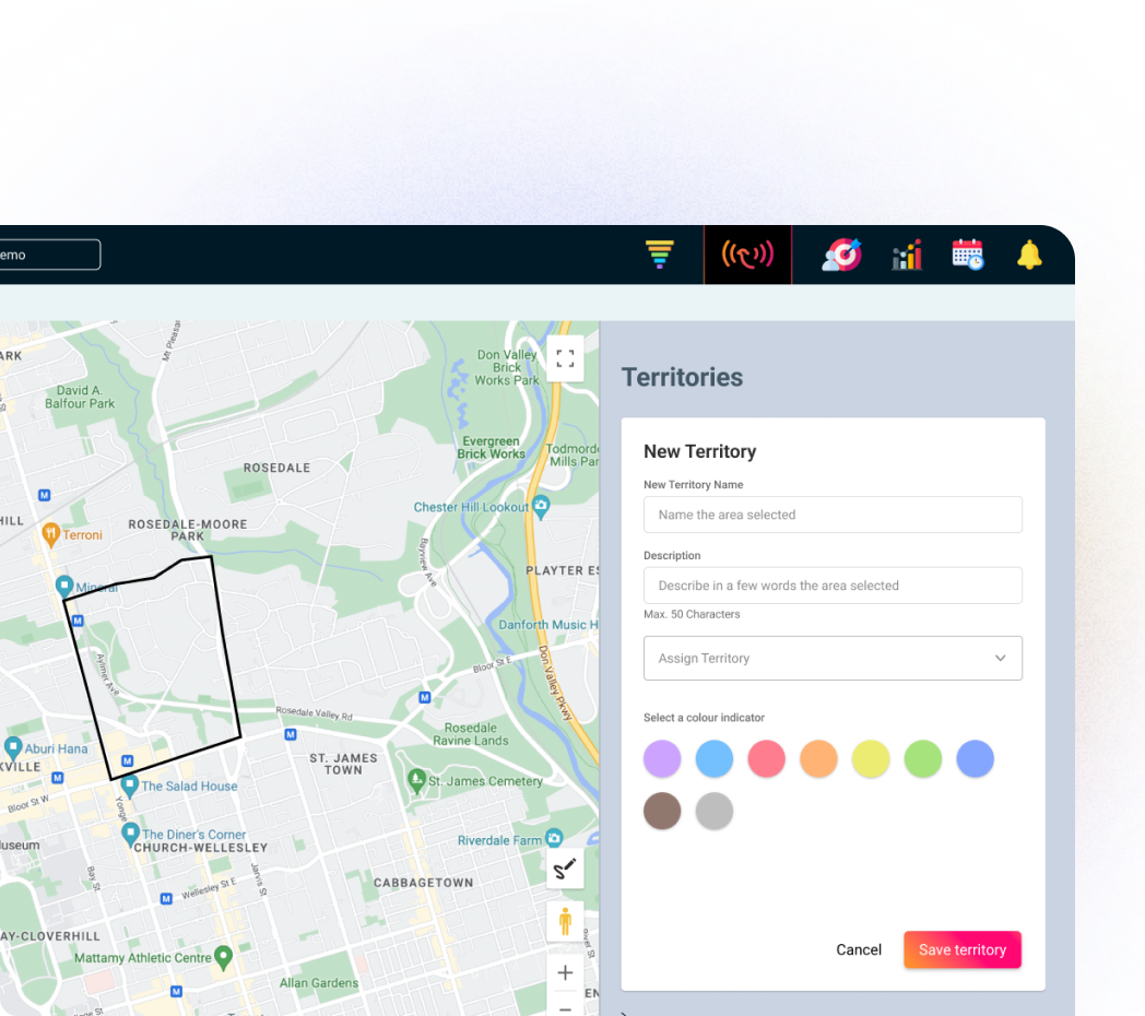 You set territories right on the Map View. Managers can geofence an area on the map to define a territory, then save or export it. You can also filter and segment by area (e.g., region/city) and load target lists so those accounts appear in the territory for assignment and tracking. Pins are color-coded by stage so managers see what’s in each territory at a glance.